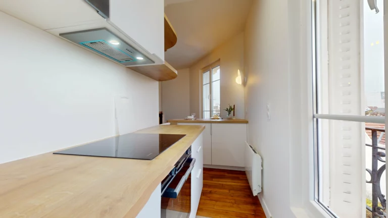 Une partie de la cuisine a ainsi été utilisée pour créer une salle d’eau tout en conservant le WC séparé. La suppression du débarras et l’ouverture de la cuisine dans le séjour ont permis d’atteindre une superficie très confortable de 21m2 pour la pièce de vie. La cuisine quant à elle, a été habilement meublée pour se fondre complètement dans le séjour grâce à son électroménager encastré et à l’îlot central faisant office de table haute. Enfin, deux grandes chambres (11m2 et 11,50m2) accessibles par un couloir permettent de s’isoler du bruit et de télétravailler confortablement : quoi rêver de mieux ?
