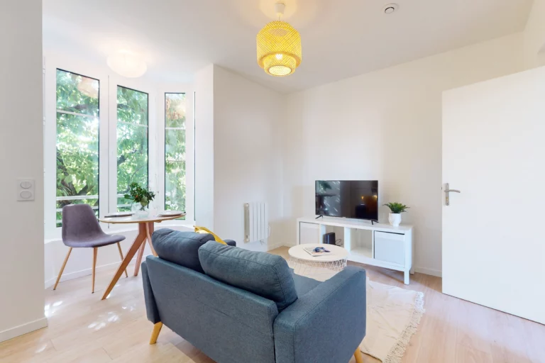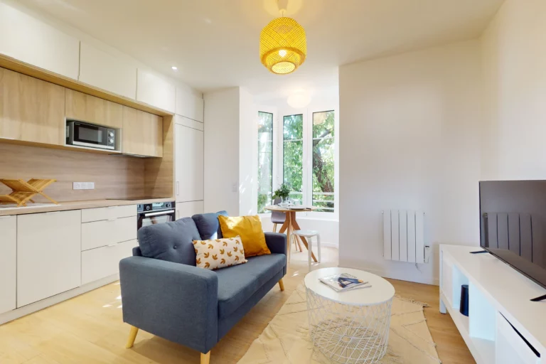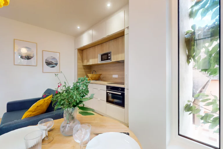 Anciennement, l’appartement était un local professionnel accueillant un dentiste. Nous l’avons transformé en une charmante colocation de 3 chambres. Pour cela, nous avons du déplacer la cuisine dans le salon pour installer une salle de bain qui n’existait pas à l’époque.