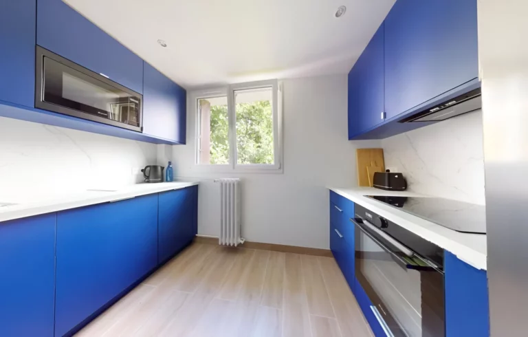 L’appartement dégage un style luxueux. Son entrée bleu profond, qui s’étend jusqu’à la cuisine, marque vraiment le coup.