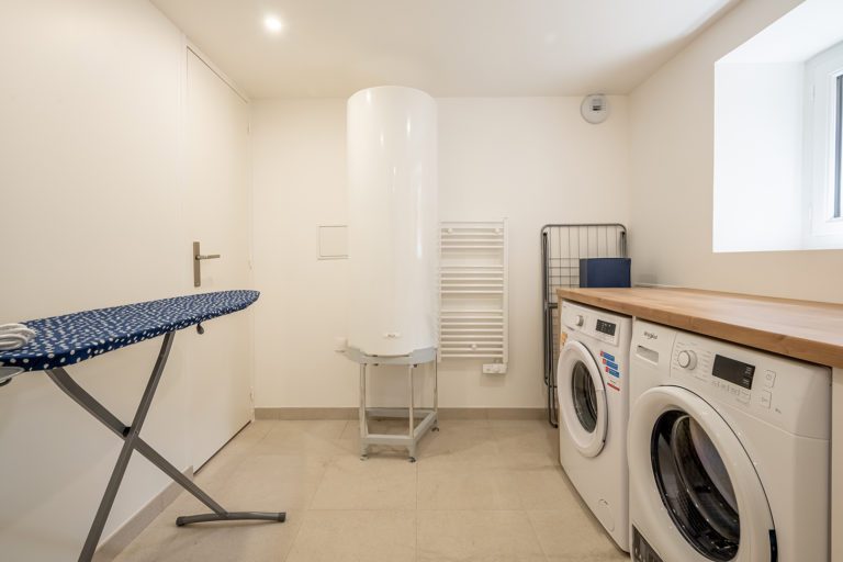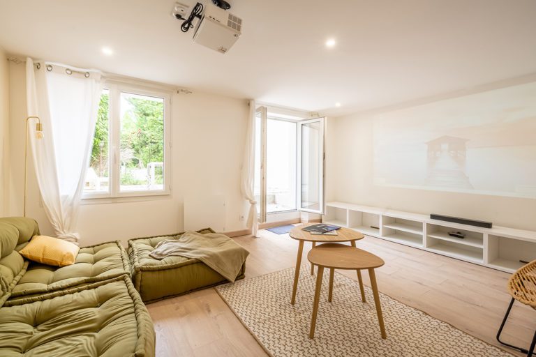 Pour mettre à profit l’ensemble des atouts de la maison, il était nécessaire de transformer le niveau de cave au rez-de-jardin. La hauteur sous-plafond d’origine étant de 2 mètres, nous avons réhaussé le plancher du RDC pour augmenter la hauteur. Ainsi, nous avons pu installer un grand espace de séjour transformable en salle de cinéma et donnant directement sur le grand jardin de 200m². Le reste du rez-de-jardin a été transformé en pièces de service : buanderie, cellier, local technique, qui apportent un confort supplémentaire aux occupants.