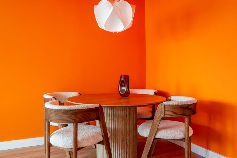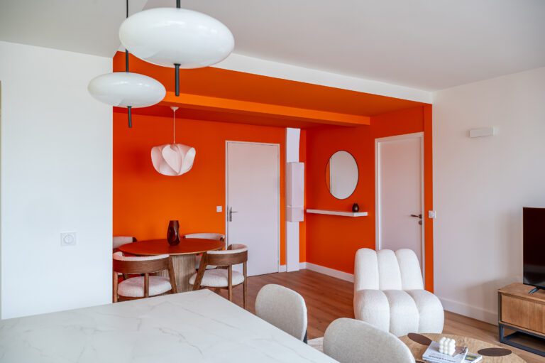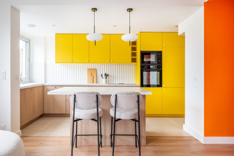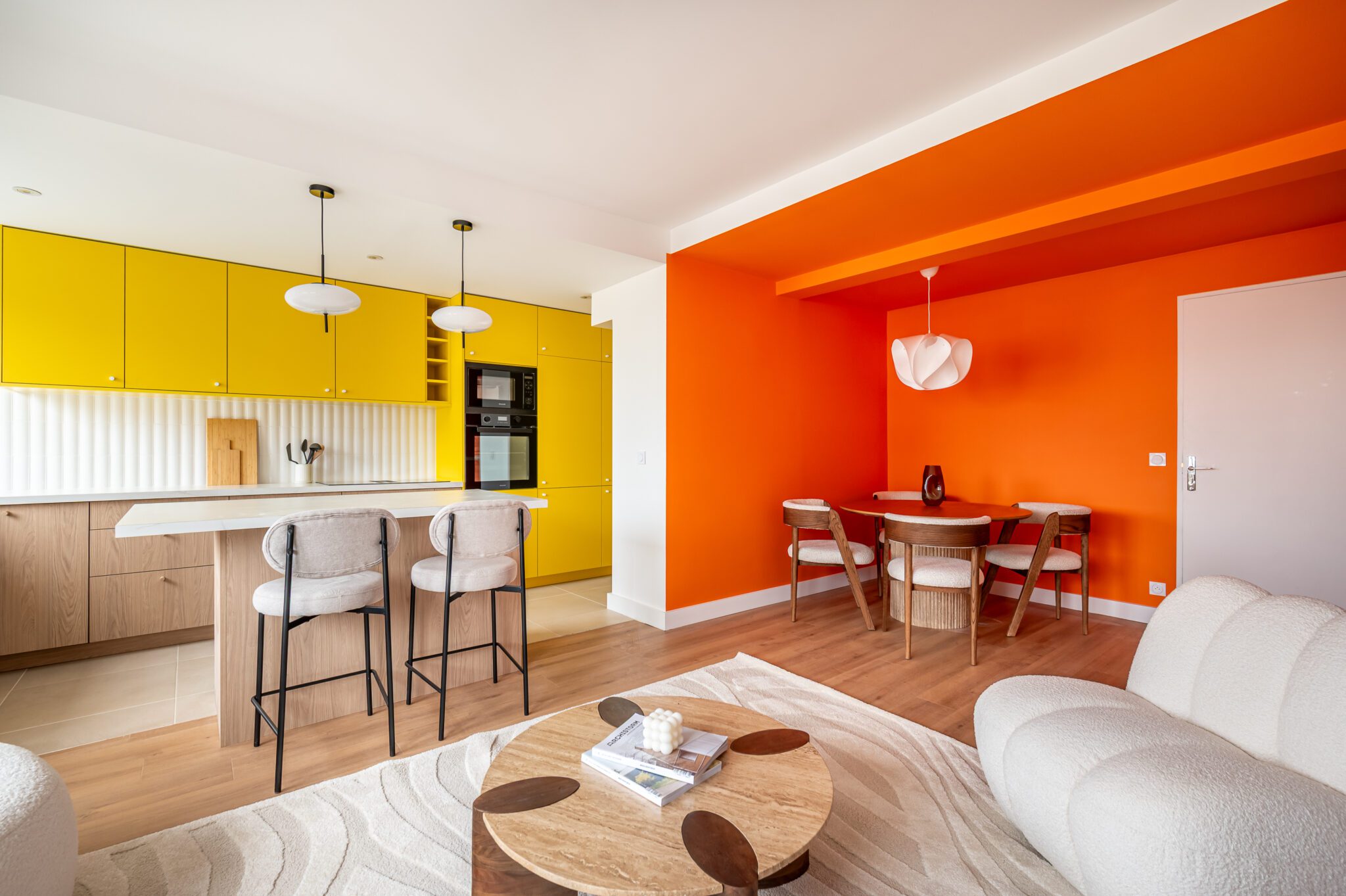 L’un des éléments phares de cet appartement est l’audacieuse boîte orange qui délimite l’espace de vie principal, accompagnée de la cuisine jaune qui illumine littéralement la pièce. Ces couleurs vibrantes créent une atmosphère chaleureuse et dynamique, donnant l’impression d’un ensoleillement constant. Ce jeu de couleurs uniques et tendance confère à l’appartement une personnalité forte, tout en le distinguant des autres biens sur le marché.