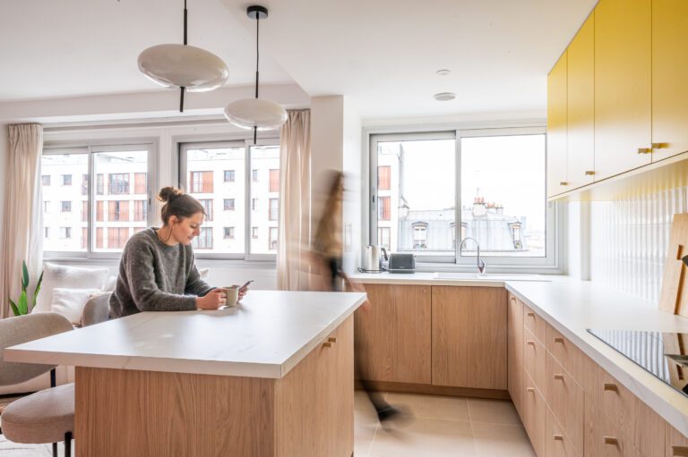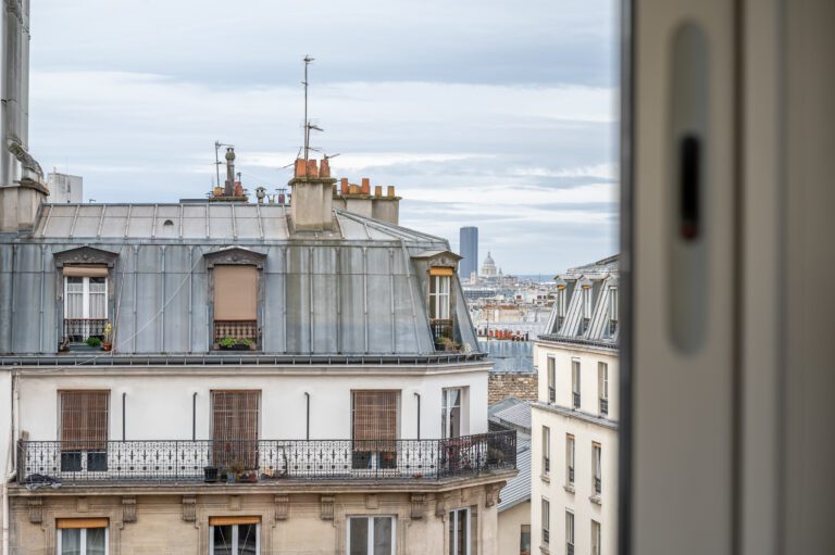 La vue depuis la cuisine, donnant sur la Tour Montparnasse et le Panthéon, offre un panorama exceptionnel, ajoutant une touche de luxe et de tranquillité au cadre de vie.