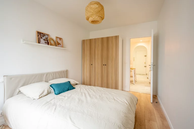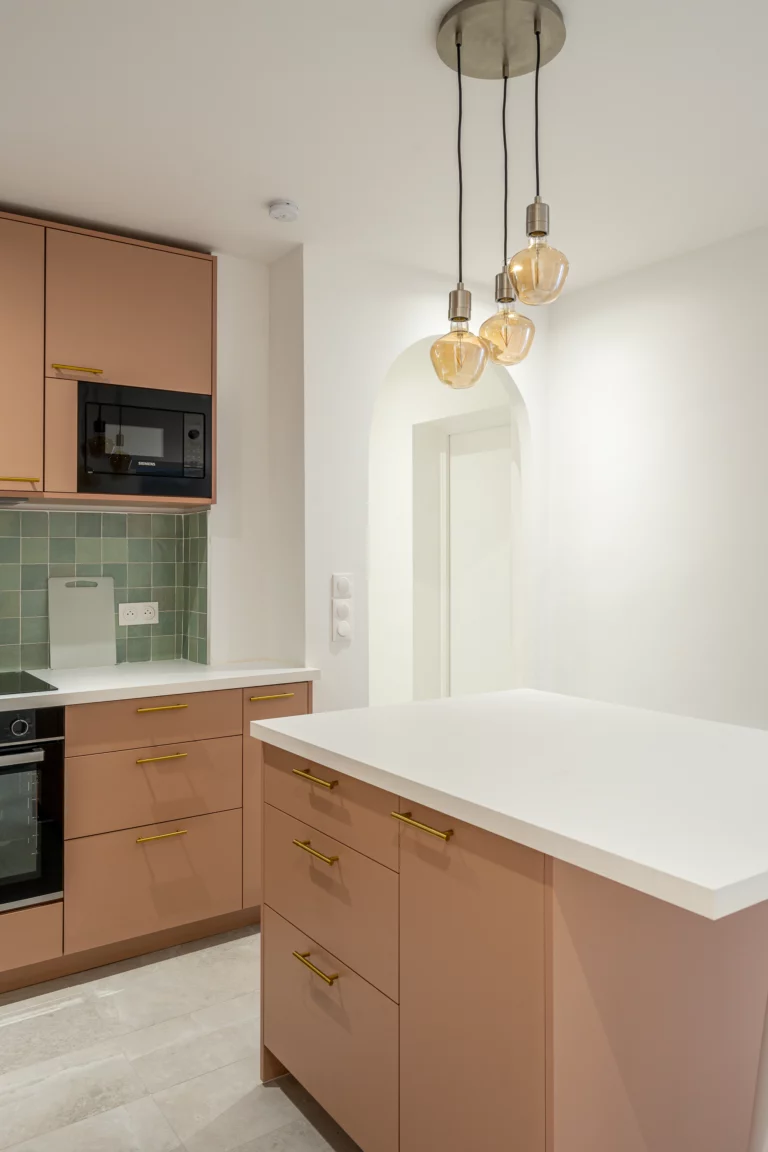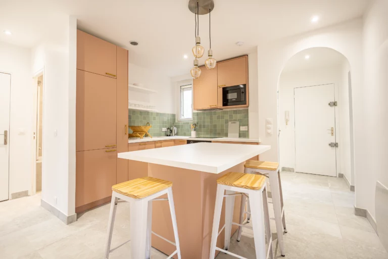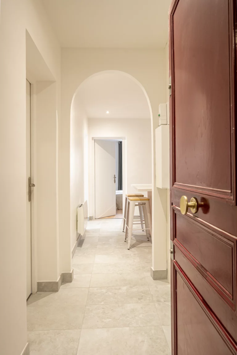 Pour ce projet, nous avons transformé un appartement qui a la particularité d’occuper l’angle du bâtiment. Cette position est souvent idéale car elle permet de bénéficier d’un large éclairage et il est généralement possible d’optimiser l’agencement du logement pour n’avoir que peu ou pas de couloir.