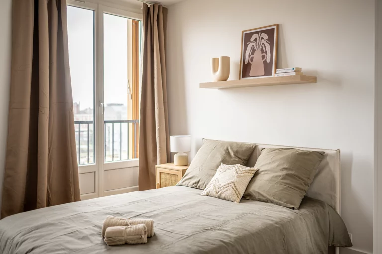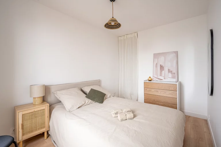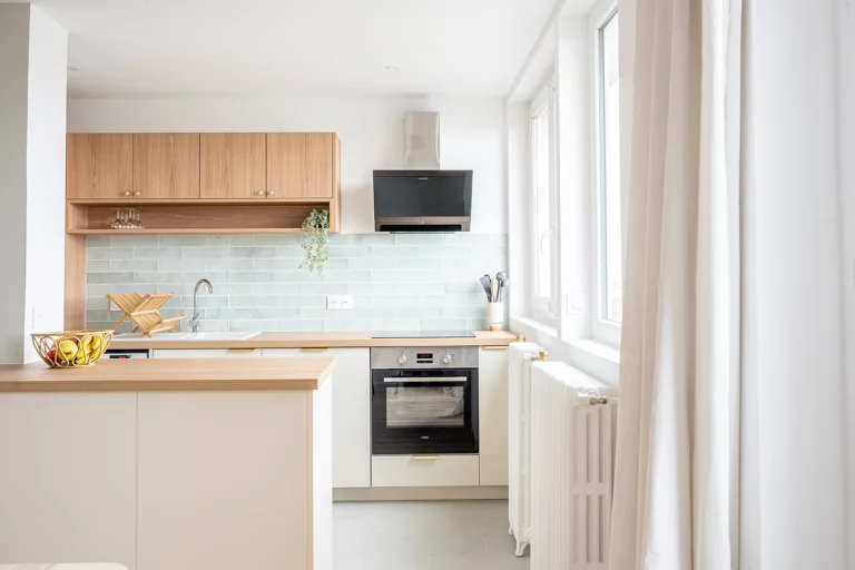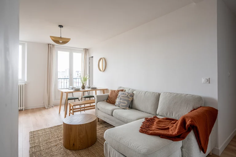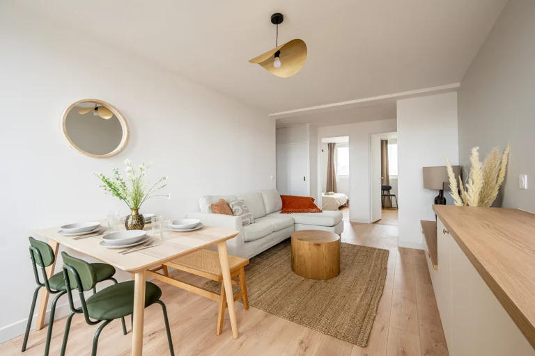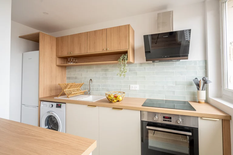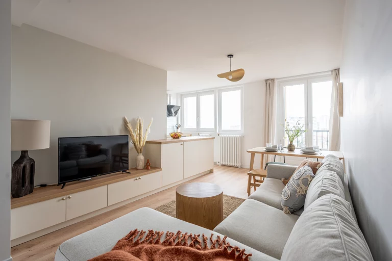 Toujours dans l’optique d’optimiser les espaces dans 61,5m2 et de maximiser la valeur locative, nous avons redéfini la disposition de la cuisine et du séjour pour créer une troisième chambre tout en offrant un espace de vie lumineux et distribués autour d’un îlot central. Un premier projet pour notre nouvelle architecte d’intérieur qui s’est plus que surpassée en imposant son style épuré et chaleureux, idéal pour une colocation cosy et intemporelle.