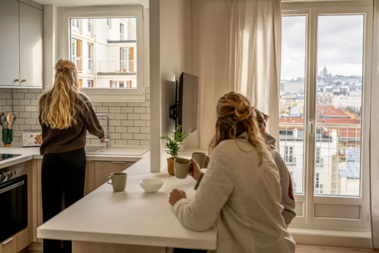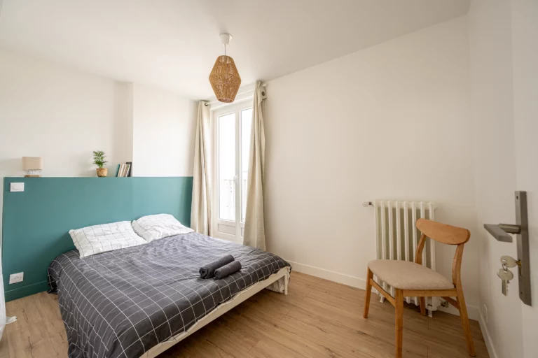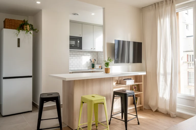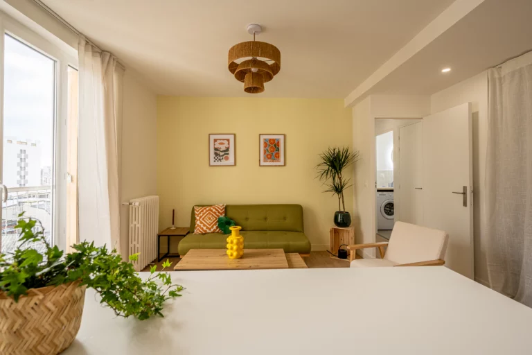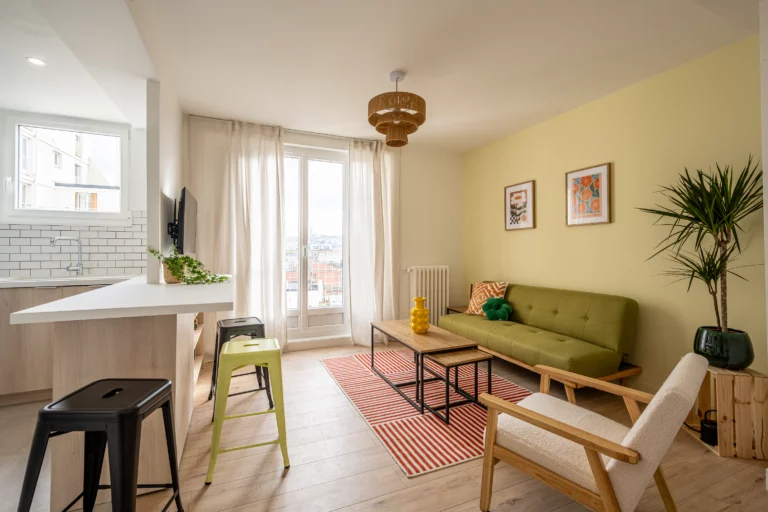 D’autre part, savoir se projeter et optimiser l’espace est l’un des points forts de nos équipes. Cela nous a permis de transformer astucieusement ce T3 en T4 en créant une troisième chambre et en réagençant totalement les espaces communs pour obtenir cette grande pièce ouverte sur le séjour, la cuisine et l’entrée, distribués autour d’un îlot central. Nos architectes d’intérieur ont agrémenté le tout d’un aménagement pop et coloré permettant de rendre cette atmosphère conviviale et joyeuse propre à nos colocations.