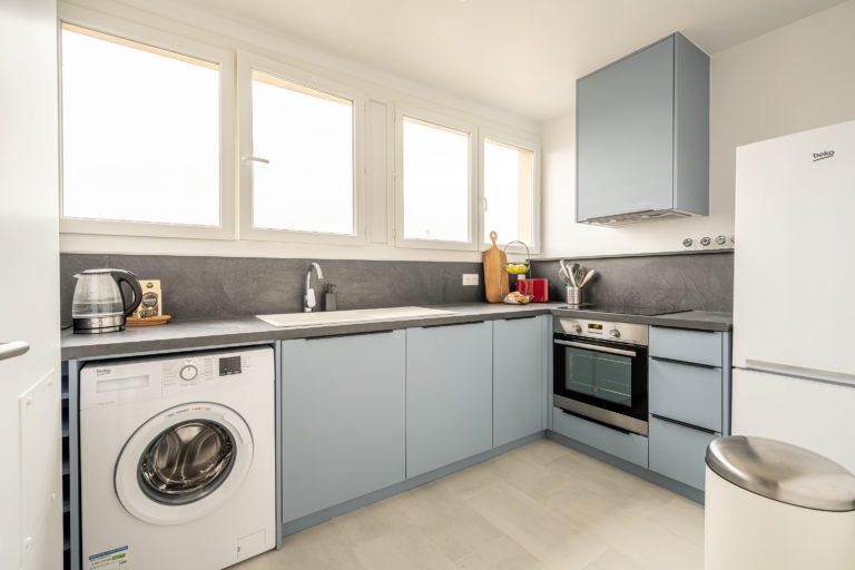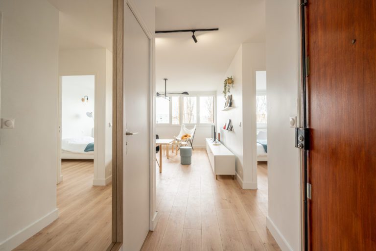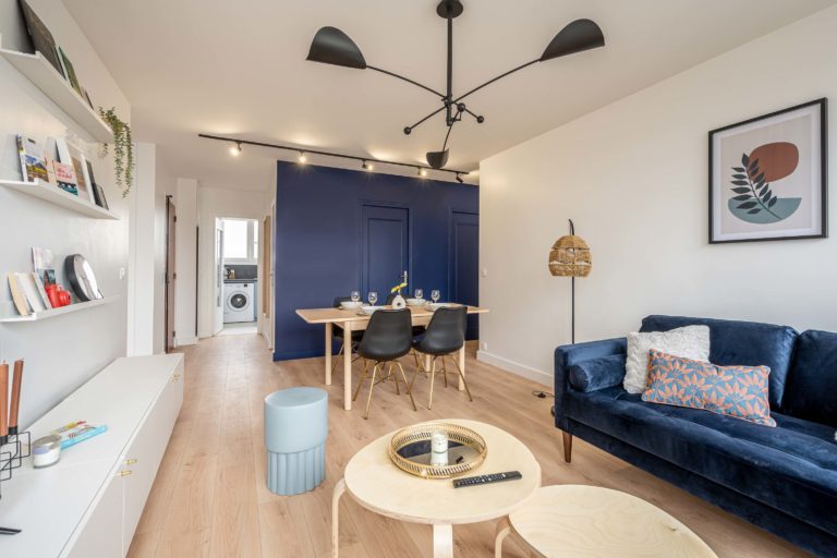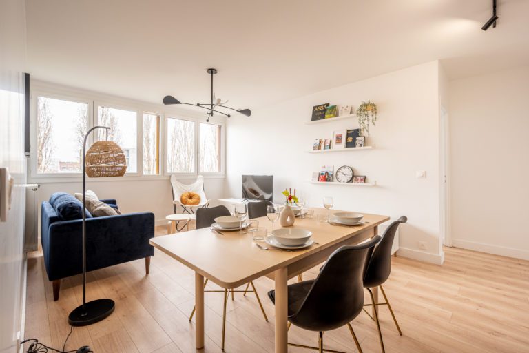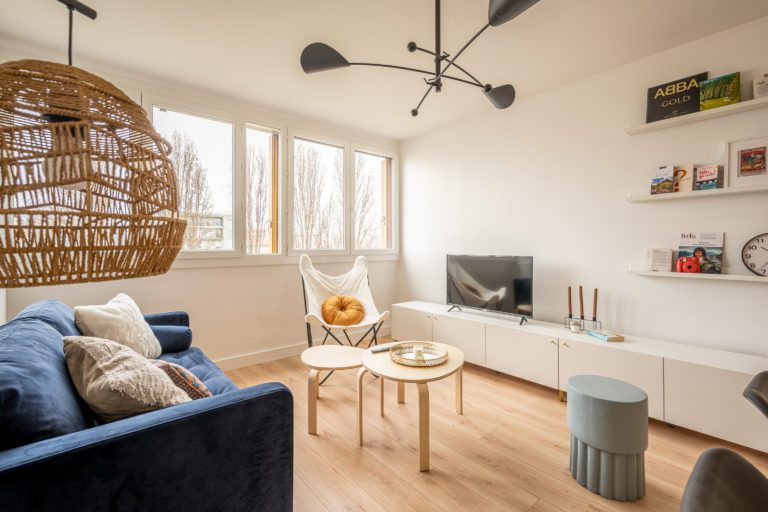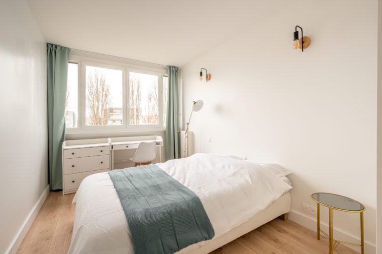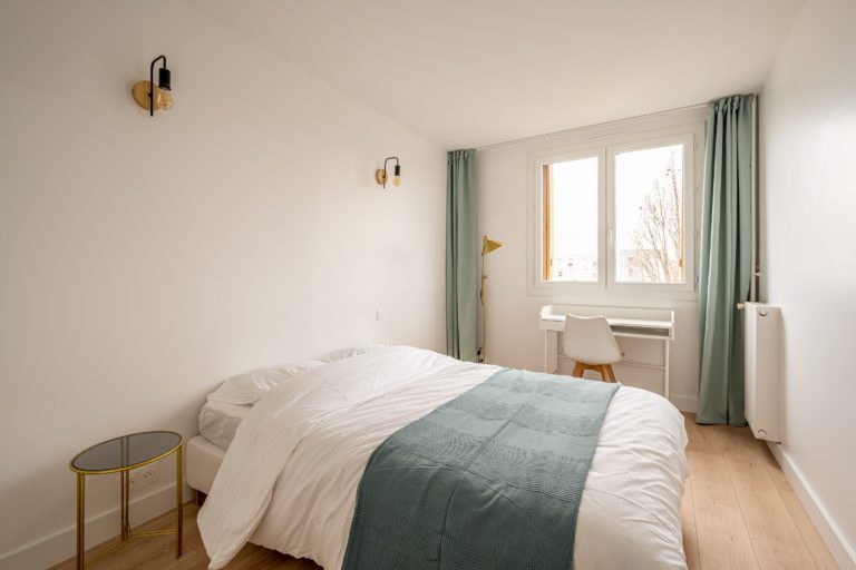 Dès l’entrée, nous entrons dans un beau séjour-salle à manger lumineux de 22 m² avec une décoration contemporaine. La cuisine séparée de 7,5 m² a été entièrement équipée et refaite sur mesure. Trois belles chambres de 11,5 m² sont meublées chacune d’un lit double, d’un bureau et d’un dressing. La salle de bain à partager se veut contemporaine et colorée.