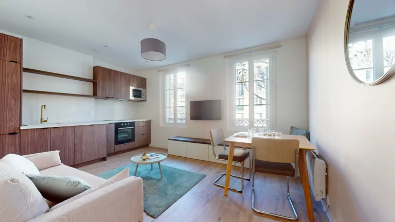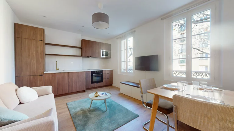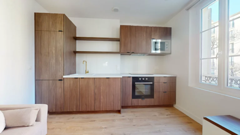 Nos architectes ont dû totalement repenser le plan pour y intégrer 3 chambres, et surtout, créer et raccorder un vrai WC. Un travail conséquent, qui a débuté bien en amont de l’acquisition par de l’administratif pour que l’urbanisme et la copropriété valident le projet. Nous avons également fait preuve d’ingéniosité pour réagencer et optimiser les espaces dans un plan restreint et contraint par l’emplacement du WC. Enfin, notre créativité, dans le choix des meubles et de la décoration, ont permis de conserver cette ambiance « rétro chic » du quartier : la cuisine en noyer, les jeux de contrastes entre les couleurs chaudes et naturelles… Des petites touches qui n’ont fait que bonifier le rendu final de cette colocation inédite.